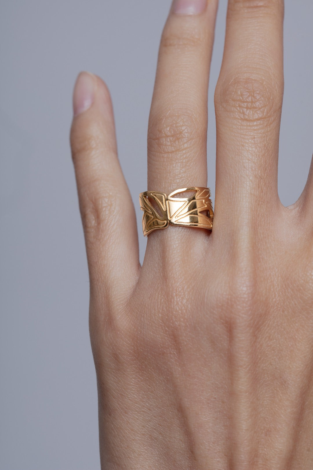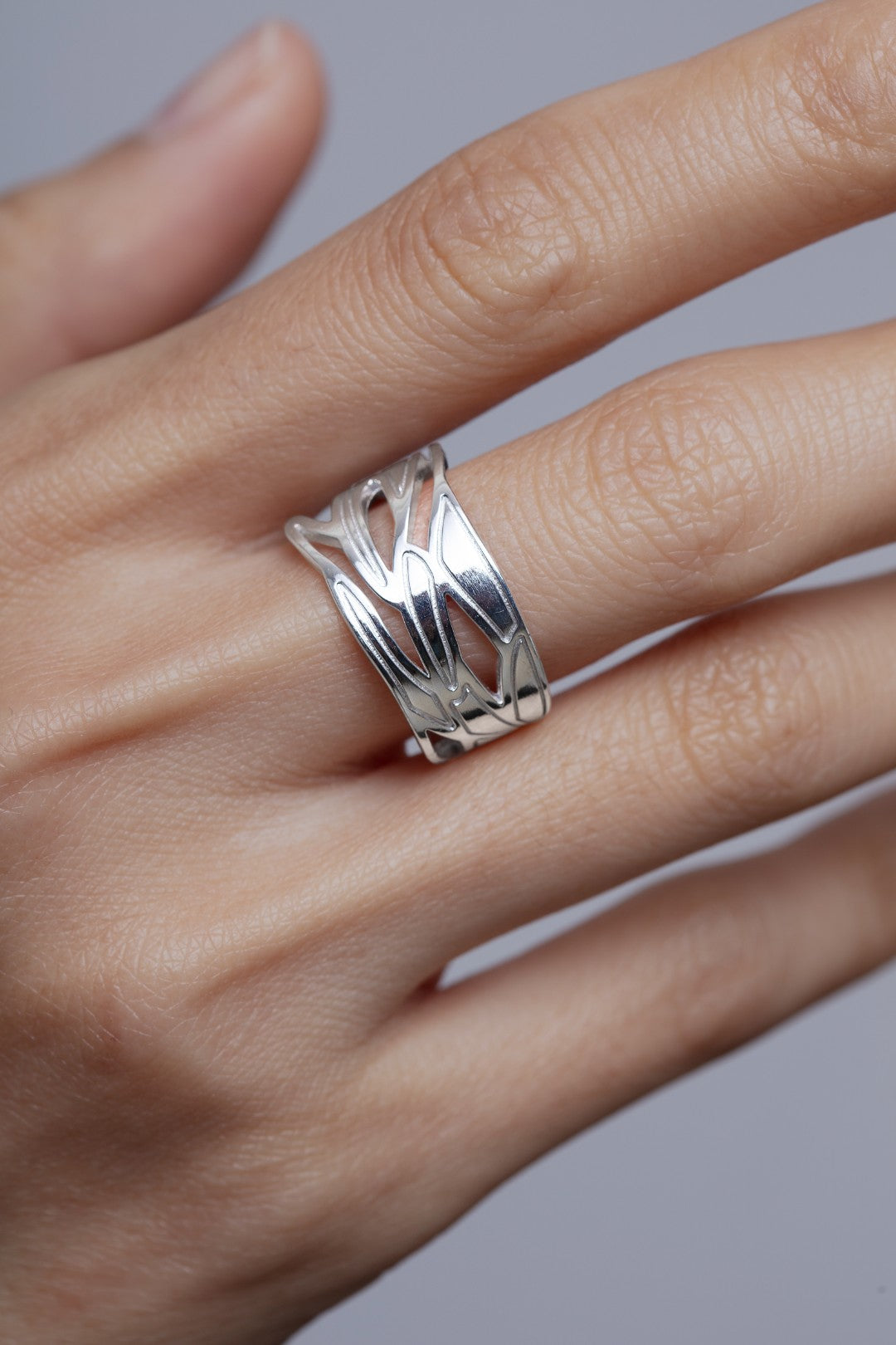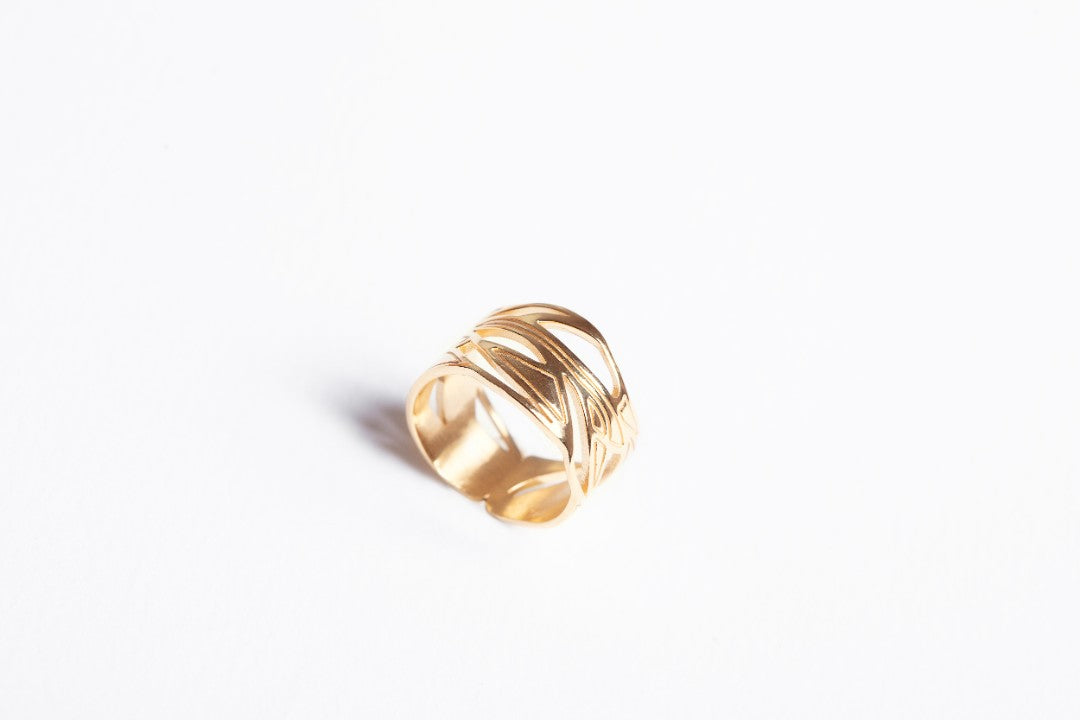 This sculptural band ring is a modern take on those original drawings. Its organic, flowing form wraps around your finger like intertwining branches, designed to be a striking piece of wearable art.