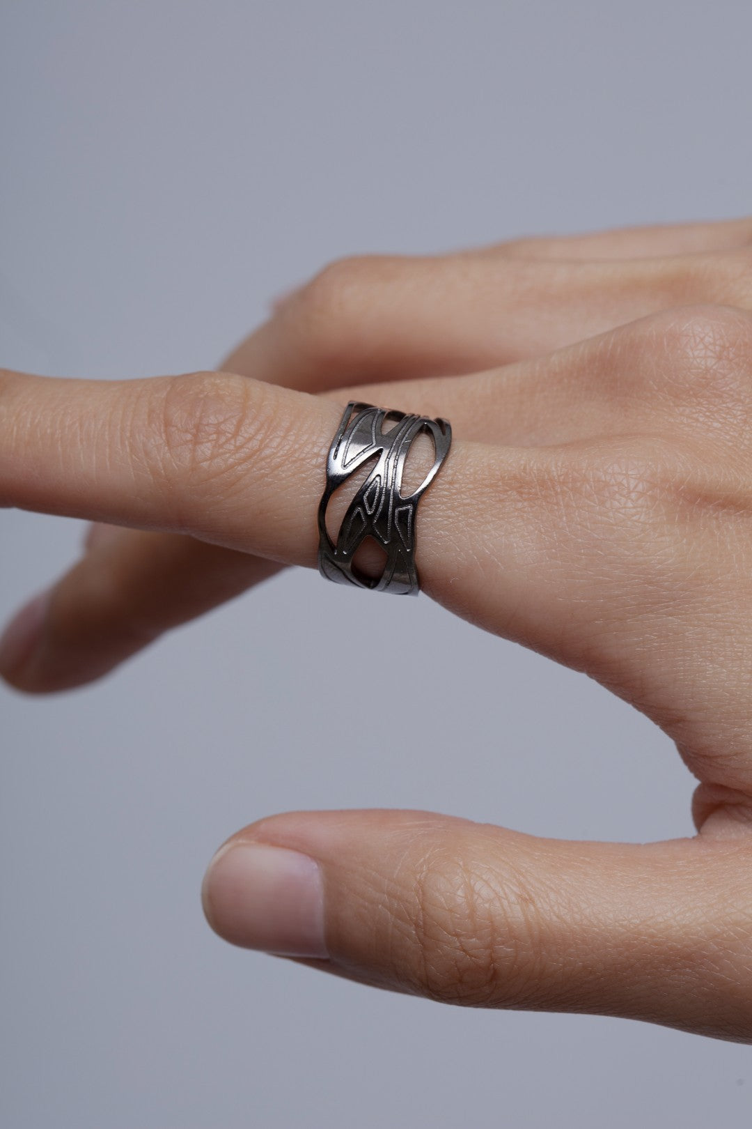 It is truly a statement ring, designed to stand out while still keeping the elegant and minimalist feel of the collection. Available in 925 sterling silver, gold, and rhodium black plated versions, each finish reveals a different mood: timeless, warm, or bold.
